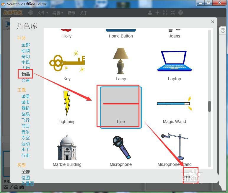 5、在物品类别找到并选中需要的直线,然后按确定;