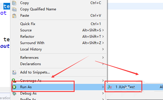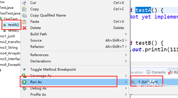 然后选择测试方法,右键单击 Run As -> Junit Test。