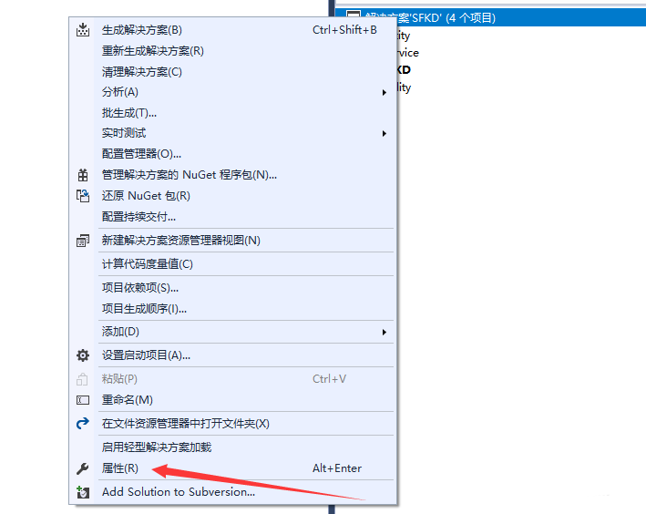 2、接下来我们右键解决方案,选择属性,如下图所示。
