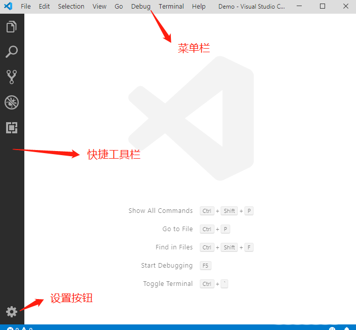 1、打开visual studio code之后,界面如图所示。最上方的是菜单栏,左侧的是快捷工具栏,设置按钮就在左侧的最下方