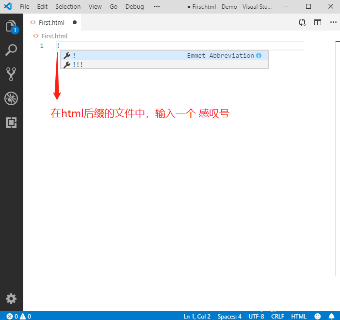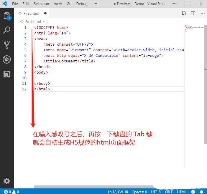 7、当保存为html结尾的网页格式文件之后,在文件的开始处,输入一个感叹号,再按一下Tab键,就能自动生成符合H5规范的html页面框架内容了