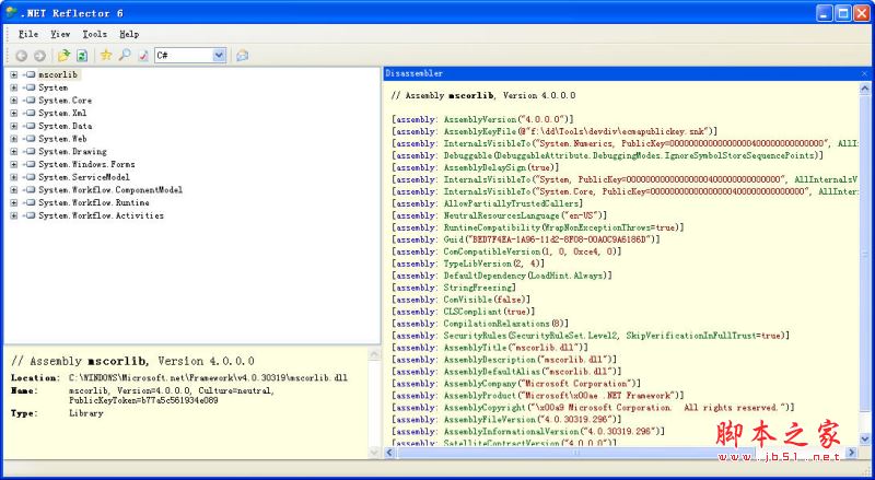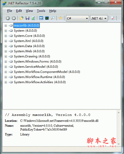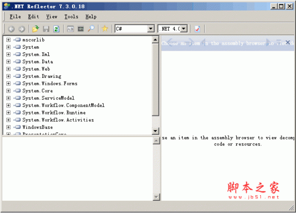 下载Reflector,解压后,双击Reflector.exe,如果有选择默认版本的.Net Framework,根据需要选择即可。你选择的版本不同则出现的默认程序集也不同。