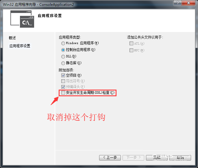 1、如果你不想在写代码的时候还要记得上述的操作,可以考虑一下这个方法。即在最初创建项目的时候,在向导里的最后一步的界面里,取消掉“安全开发生命周期检查”前默认的勾选即可。