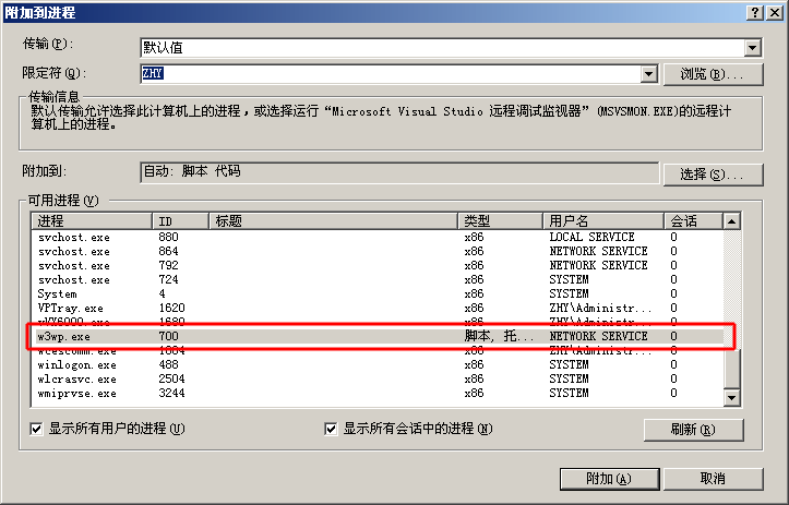 3,打开asp文件,然后“附加进程”,如图: