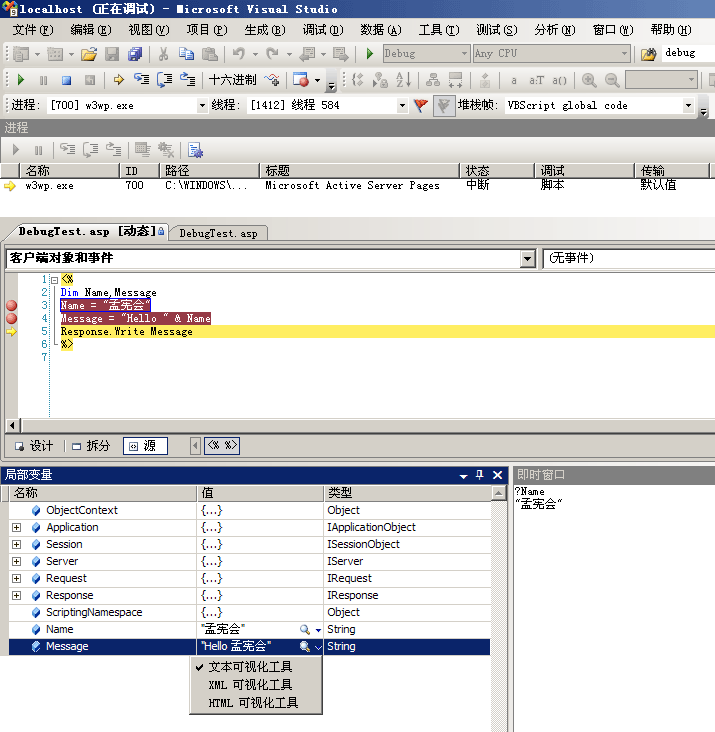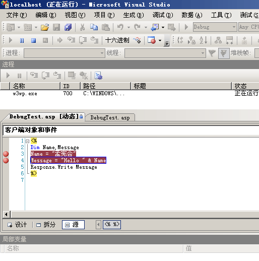 5,用浏览器打开页面,VS2008 SP1就会在断点处停住。如图: