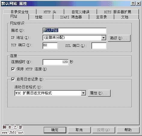 用鼠标右键单击“默认Web站点”,在弹出的快捷菜单中选择“属性”,此时就可以打开站点属性设置对话框,(如图4)在该对话框中,可完成对站点的全部配置。