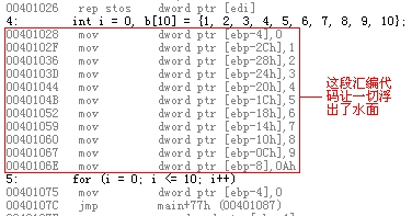 也好,那么让汇编来告诉你——以及我——这一切的真相吧,在这之前请你把i和b[10]的定义改成: