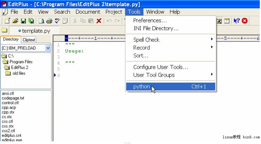 这样在Editplus里打开一个python文件,在tools菜单下就会有一个python选项,直接单击就可以运行python程序了,也可以利用快捷键(Ctrl+1),根据设置用户工具的个数,这个快捷键可能有所不同。