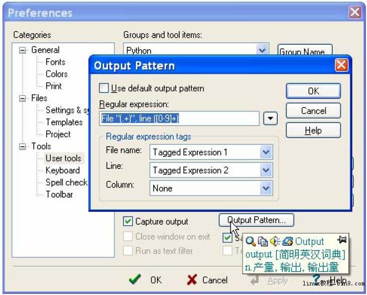 此时,可以根据提示的行号到文本中去找错误的地方,而不能够象其他的编译器一样直接双击错误的提示,将光标直接移动到错误行。此时如果直接双击某行,则会出现找不到某文件的错误。此处,可以利用Editplus的Output Pattern的实现这个功能。具体做法如下,在图(1)中的Capture Output选项前的复选框要选上,然后打开Output Pattern按钮,在Output Pattern对话框中,首先取消Use default output pattern选项前的复选框,在Regular expression栏里填入正则表达式如下: