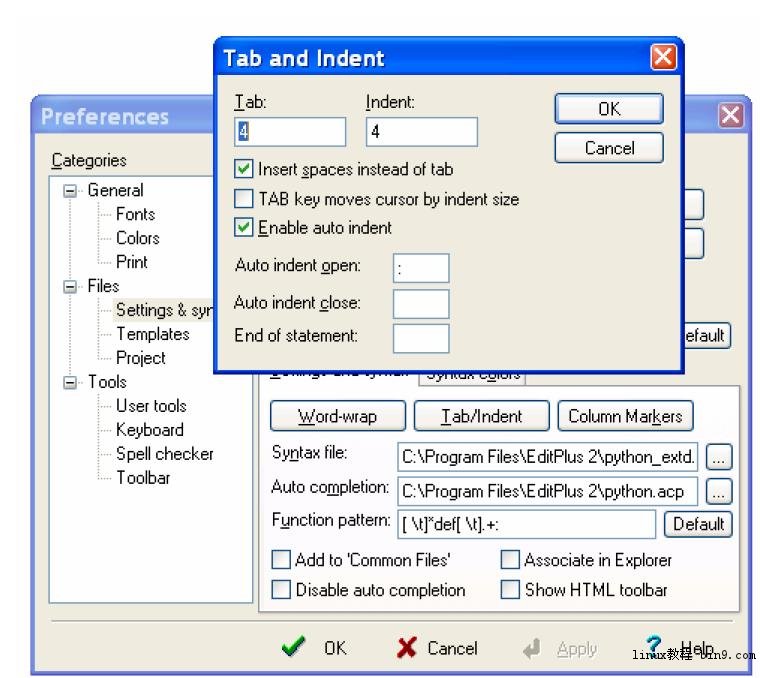 让editplus自动识别冒号然后直接缩进,并且如何修改缩进的长度:在图(4)中,可以看到一个Tab/Indent标签,打开他可以看到Tab,Indent的选项,分别填入自己习惯的距离。并且选中Insert spaces instead of tab和Enable auto indent。然后在Auto Indent open里填入一个冒号“:”。完成设置以后如下图