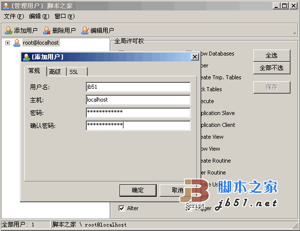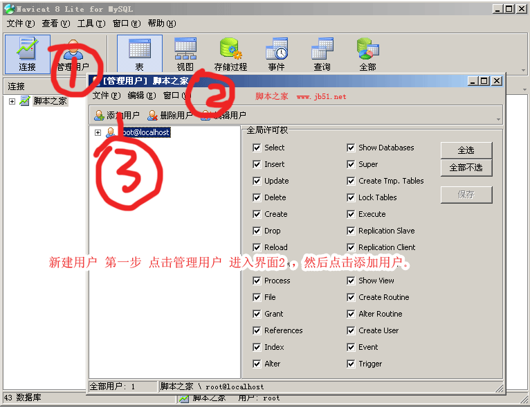 新建用户jb51后,选择jb51需要管理的数据库,这里以114la为例,鼠标点击114la,右边出现了权限,一般情况下全选保存即可。