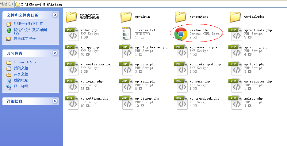 6.htdocs文件夹即为网站的根目录。将已解压的WordPress文件夹中的文件复制到htdocs文件夹中。完成后显示如下图内容,接着打开readme.html;