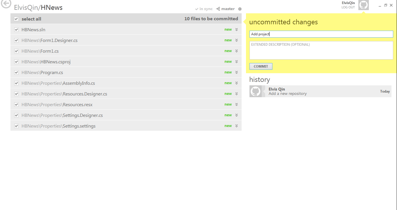 5. 将修改提交到本地仓库,回到Github for windows中,已经可以看到刚才添加的项目了,同样,提交注释提交到本地仓库: