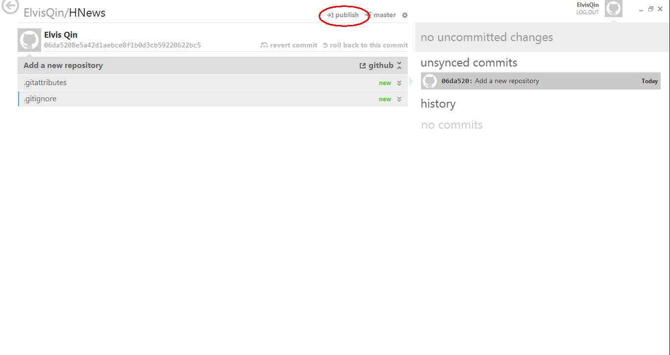 5. 这个时候我们就可以Publish一个仓库了,Publish之后按钮就变成in sync文字,表示以后的修改提交就是同步,这个时候你到你的github上看应该就会多一个仓库了: