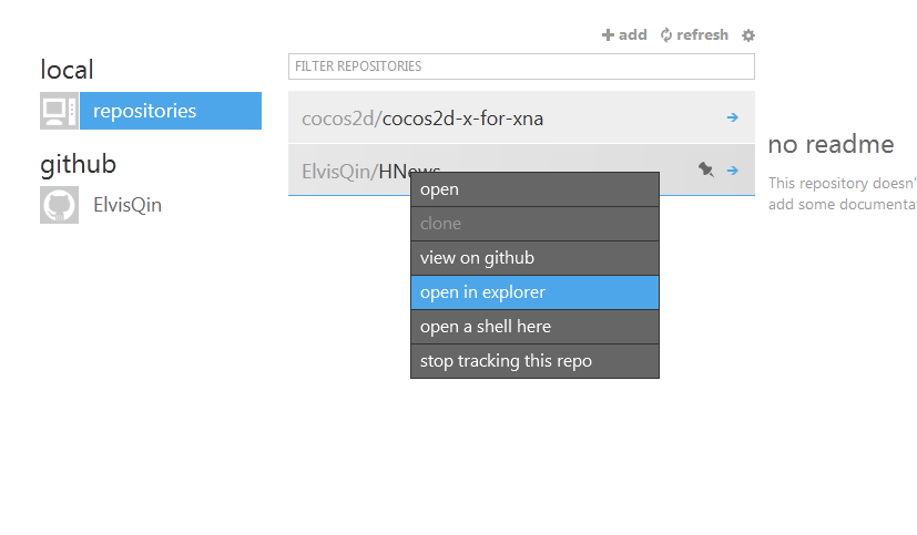 6. 添加项目,仓库在本地保存在一个文件夹中,Github for windows会监视这个文件夹,任何修改都会在仓库中看到,然后像上面一样添加评论就可以将修改提交到本地仓库,这里我们打开仓库目录,往里面添加一个项目: