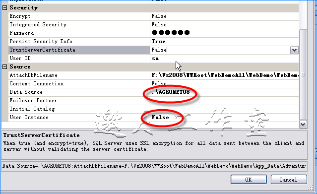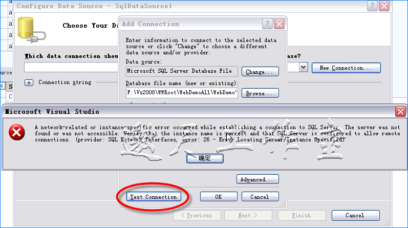 用代码直接连SQL Server服务器没有问题,但在项目中数据源改用SQL Server数据库文件时出错,提示错误如下: