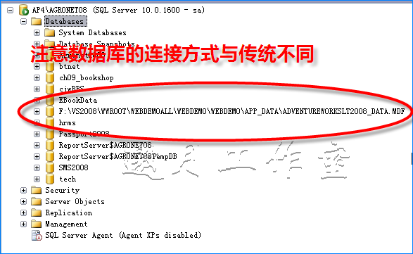 需要注意的是:脱机后,改用mdf文件直接连接,原来的逻辑文件AdVentureworksLT08.mdf对应的log文件自动失去关联,而产生了一个新的log文件,你可以关注一下数据库具体的位置,是一个mdf文件和两个log文件。AdventureWorksLT2008_Data.mdfAdventureWorksLT2008_Log.ldfAdventureWorksLT2008_Data_log.ldf(这个文件是新增的,改用mdf文件添加后,原来的log文件不再起作用,感觉是换了新的连接方式和新的存储机制。)