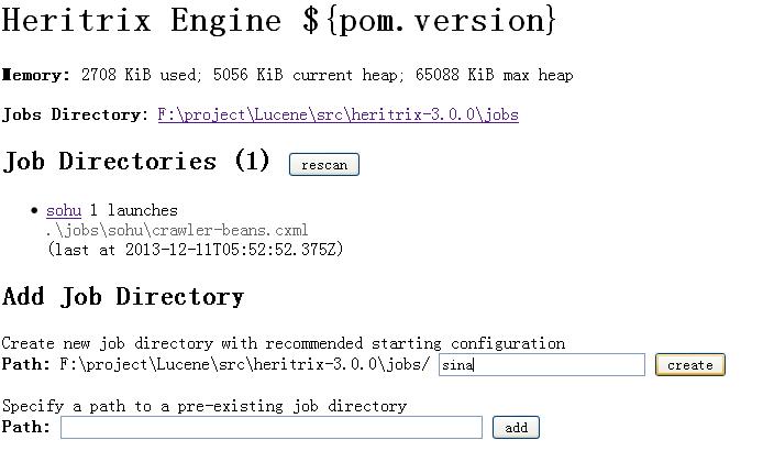 Heritrix当前版本3.1.0,安装后发现,启动任务时,Windows平台有BDBOpen的错误(具体原因不详),Linux环境没有测试。度娘了一把,没啥实质性收获,如果从源码去看,又太费时间。就换到了3.0.5,这个版本也有问题,就是创建Job时,总是提示文件夹有问题,可以选择手动创建下载任务。操作界面如下图所示: