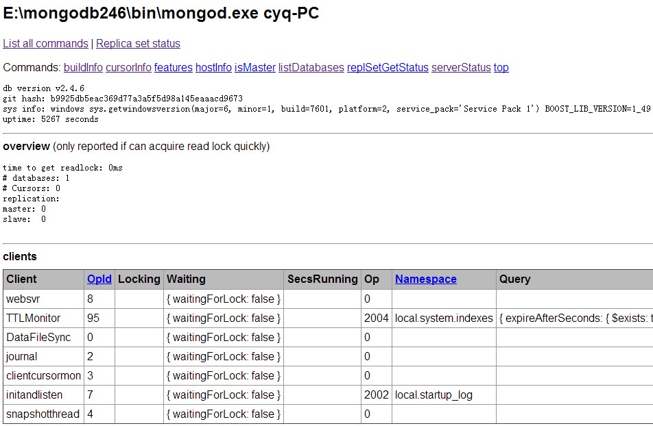 安装好后,浏览器运行:http://127.0.0.1:28017 打开有东西就说明装上了,按理是localhost:端口可上的,不知我电脑是有缓存还是咋的,没反应,换上IP刷新就好了。