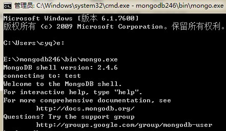 正常来说,在cmd命令下,运行E:\>mongodb246\bin\mongo.exe,(路径自己弄对)直接就连上了:
