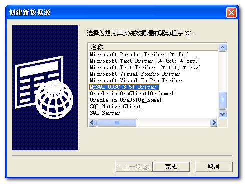 切换至系统DSN选项卡,点击添加按钮。弹出创建新数据源对话框,选择MySQL ODBC 3.51 Driver驱动程序,点击完成按钮,如下图所示。