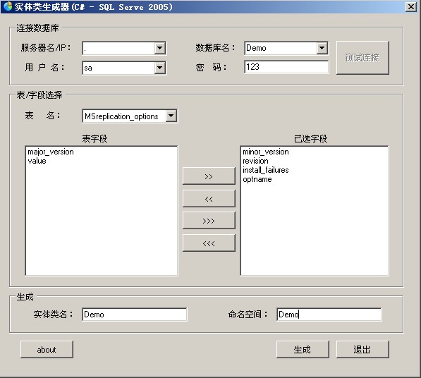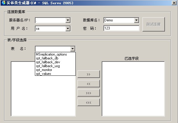 四、选中表名下拉对话框中的任意表名,则程序自动将该表中所有的字段填充到左侧ListBox中,此时,你可用选择需要生成实体类的字段,并移动到右侧的ListBox中。如图(五)