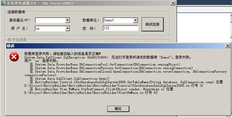 三、点击测试连接按钮,尝试连接到服务器,如果连接成功,第二个和第三个GroupBox将变成可用状态,且表名下拉对话框中将绑定该数据库对应的所有表名;如果连接失败,则抛出异常信息。连接成功如图(三),连接失败如图(四)