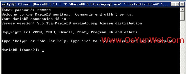 打开MySQL Client (MariaDB 5.5),输入上面设置的root密码登录,如下图所示