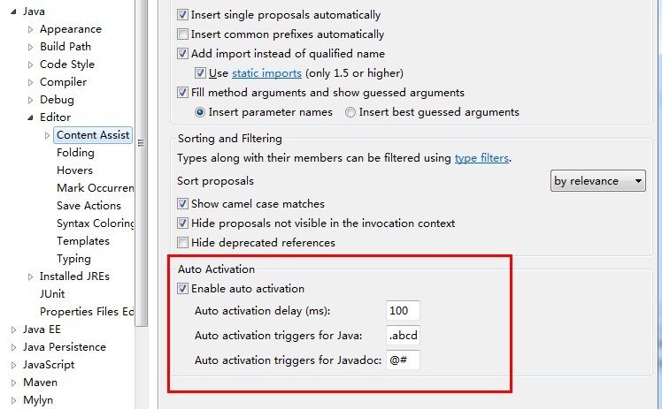在我们忘记方法名或者想偷懒时,代码自动提示很管用。不过Eclipse默认是输入"."后才会出现包或类成员的提示,也就意味着我们必须先输入一个完整的类名,提示才能出来;或者每次都按下 alt + / 。如何才能让它每次只要输入字母之后,也能出现提示呢?在这里可以设置: