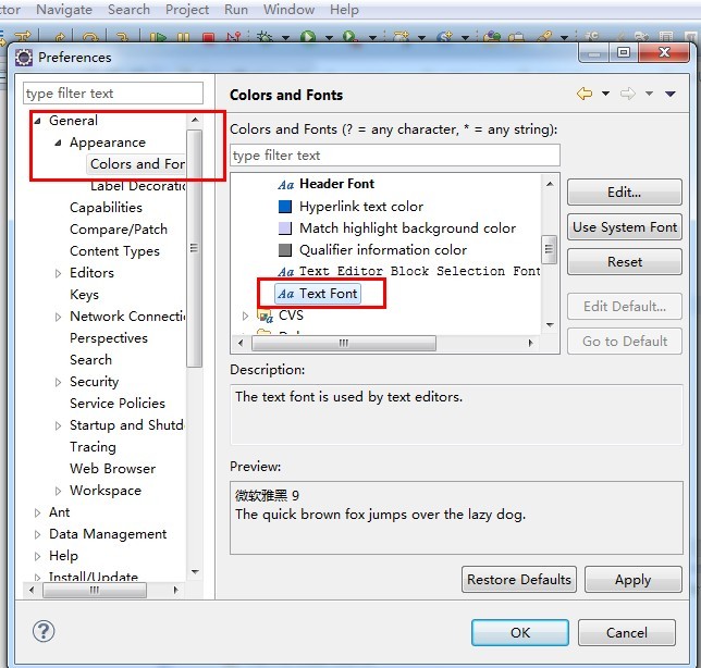 设置代码的字体类型和大小:Window -> Preferences -> General -> Appearance -> Content Assist -> Colors and Fornts,只需修改 Basic 里面的 Text Font 就可以了
