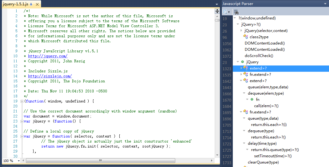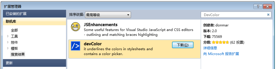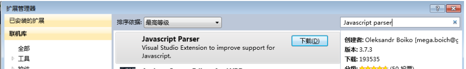由于最近写的JavaScript稍微多了一点,然后在查看的时候就很不方便,总是要拖动滚动条来查找。于是就想着这JavaScript代码能否像在C#代码一样可折叠呢?这款工具可直接通过VS的扩展管理器中进行下载,如下所示:
