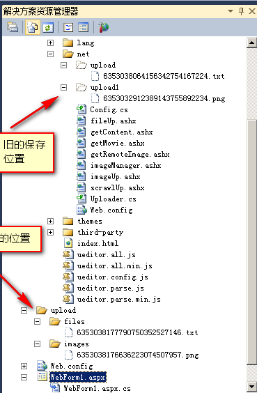 说明:1,上图箭头所指的非法上传目录,是编辑器验证图片上传的路径,以防止恶人修改js代码,非法乱上传。要防止出现这个问题,就要保证ueditor.config.js中图片上传区域中的savePath和config.cs中保持一致。