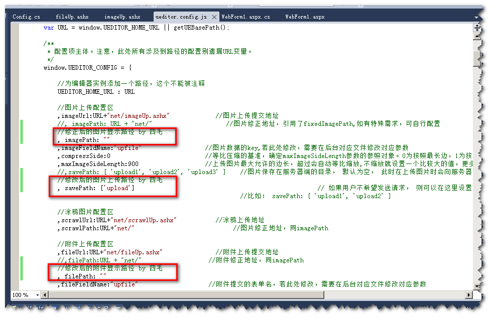 步骤3.修改Config.cs文件,见下图。因为步骤1中我们修改了ueditor.config.js中图片上传配置区图片保存路径,所以这里也需要修改否则会报:非法上传目录