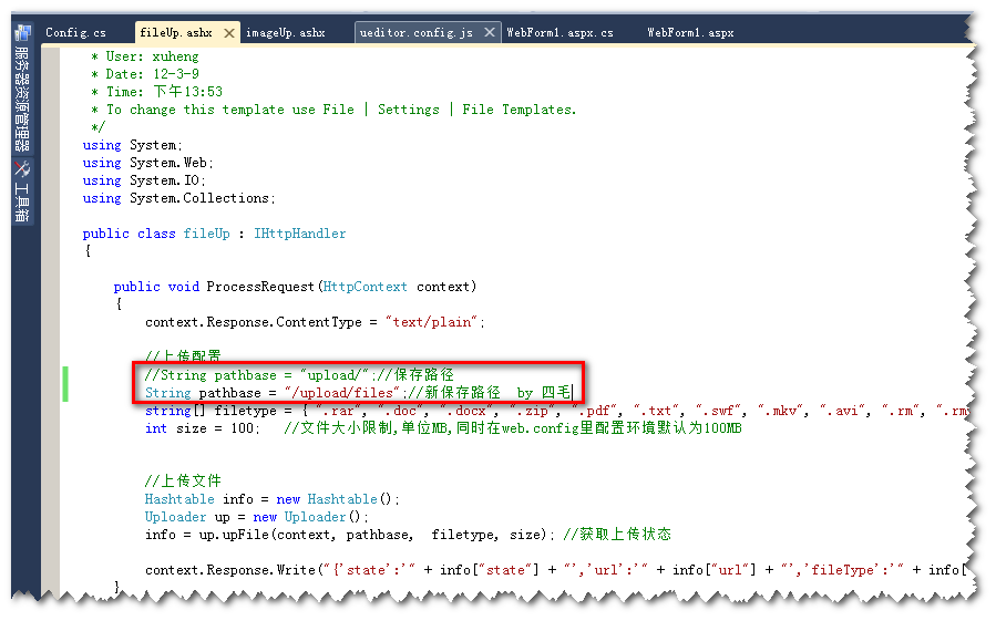 步骤4.修改fileUp.ashx文件,见下图,红色框即为修改后效果。
