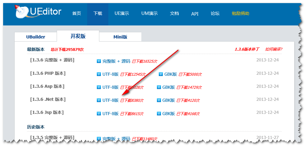 1.下载UEditor,当前最新版本是1.3.6。这里下载的.net版本,选择UTF-8。下载地址:http://ueditor.baidu.com/website/download.html