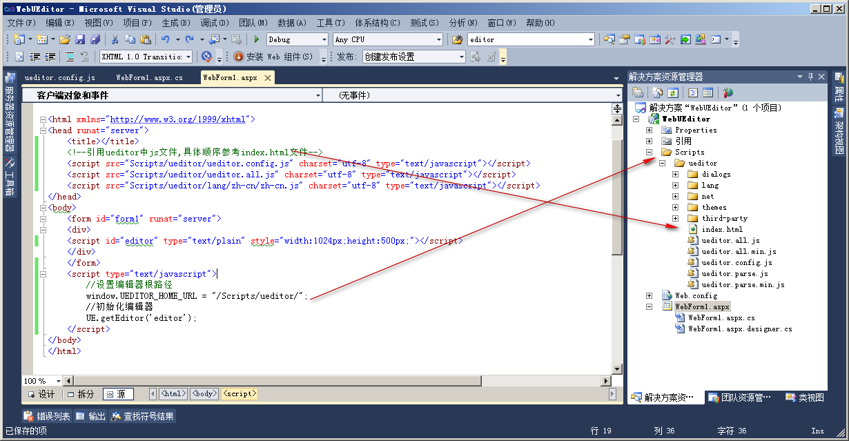 2.打开vs2010创建一个空的web应用程序,并将我们下载的UEditor,解压放到需要的地方,然后引用相关资源到页面上,我的如下: