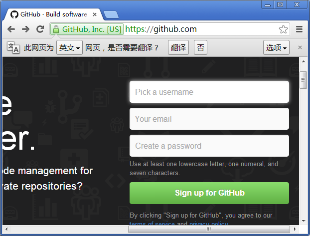 首先进入到https://github.com/ 主页,如果你没有账号的话,那么就要先进行注册。首页可直接进行注册: