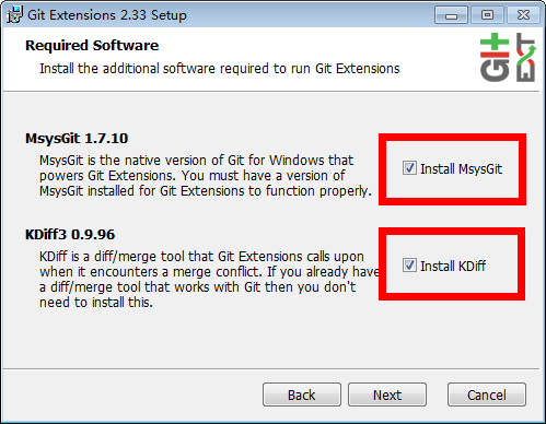 第二步:勾选以上[Install MsysGit]和 [Install KDiff],继续Next,之后就会进行安装KDiff和MsysGit。