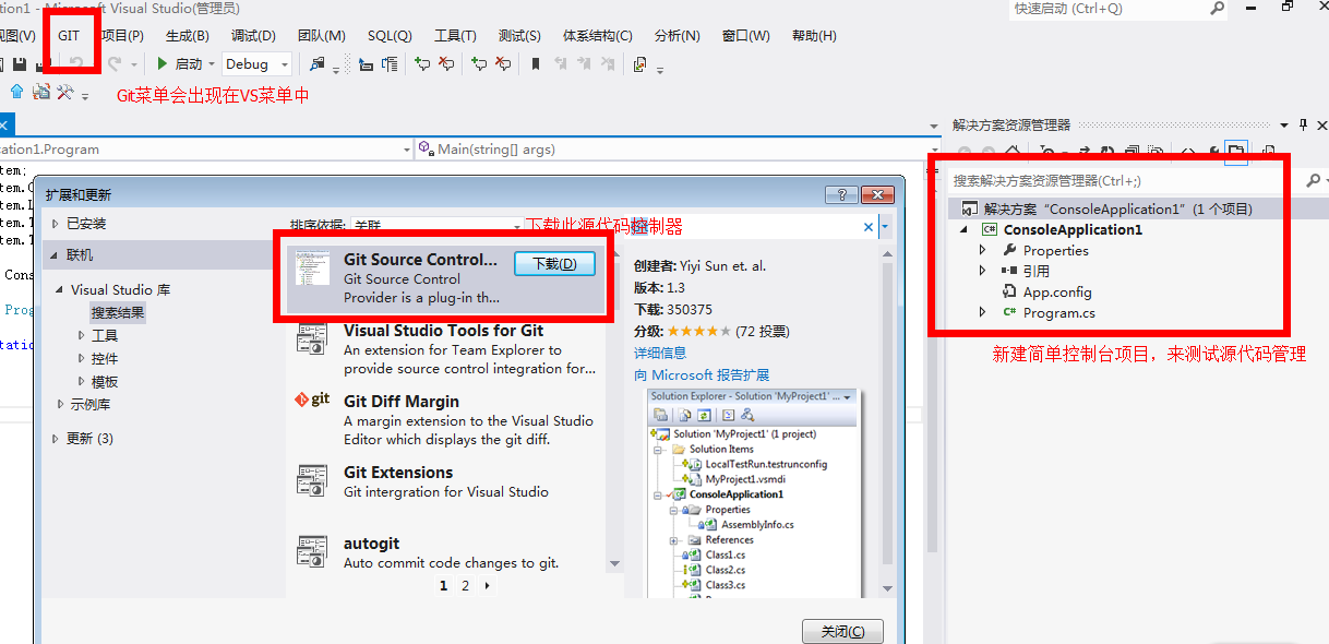 新建了一个控制台的应用程序,然后在工具菜单中的[扩展和更新]来下载Git Source Control Provider,安装之后重启VS即可。