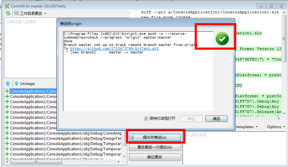 点击提交并推送之后,输入GitHub账号和密码就可以进行上传到服务器了。上传完毕就有有如上图小窗体的提示,我们再来看一下GitHub上的源代码吧。