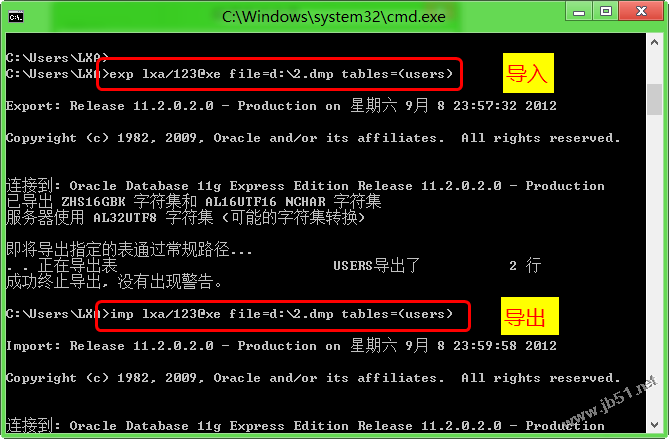 exp lxa/123@xe file=d:\2.dmp tables=(users)