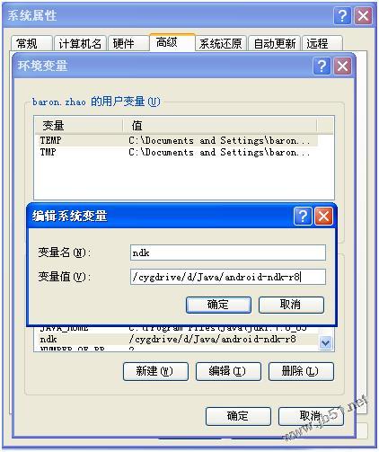 在windows的系统环境变量中添加NDK的路径。使用“/cygdrive/d/Java/android-ndk-r8”这种Linux风格路径,如果使用Windows下的“D:\Java\android-ndk-r8”,Cygwin在编译时会发出警告。