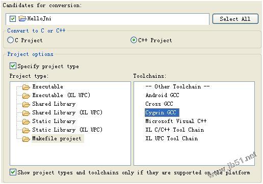 第二步:选中你刚才建的“HelloJni”工程,下面左边选“Makefile project”右边选“Cygwin GCC”。确定后提示的“透视图”不清楚是什么,点击“是”即可。