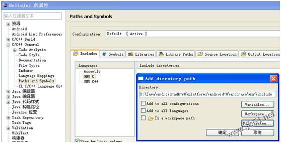 C/C++ General ->Paths and Symbols:在Includes下add新的GNU C依赖路径。此“HelloJni”工程需要“D:\Java\android-ndk-r8\platforms\android-8\arch-arm\usr\include”即可,以后根据不同项目选择不同的依赖库。