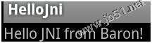 将“/HelloJni/jni/hello-jni.c”中的字符串“Hello from JNI !”如改为“Hello JNI from Baron!”,运行后在模拟器上输出的字符串改变即说明配置成功。