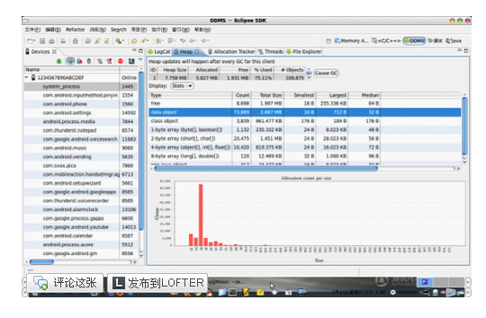 无 论怎么小心,想完全避免bad code是不可能的,此时就需要一些工具来帮助我们检查代码中是否存在会造成内存泄漏的地方。 Android tools中的DDMS就带有一个很不错的内存监测工具Heap(这里我使用eclipse的ADT插件,并以真机为例,在模拟器中的情 况类似)。用Heap监测应用进程使用内存情况的步骤如下: