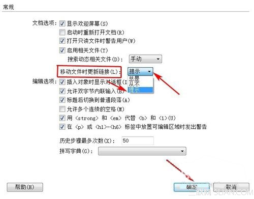 在“ 常规” 首选参数的“ 文档选项” 部分,从“ 移动文件时更新链接” 弹出菜单中选择一个选项,这个选择的是“提示”,然后单击“确定”按钮完成设置。