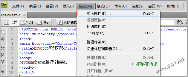 第一步:点击DW软件“修改(M)”展开后点击“页面属性(p)”