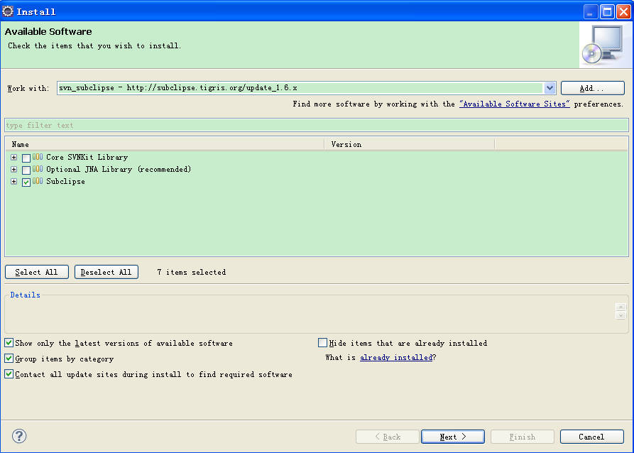 这里只选择“Subclipse”,next如下图所示.