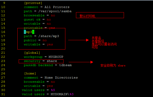 security = share //security是登录和验证方式,设置为share可以匿名访问;而如果是user这种验证方式的话,就需要用户名和密码